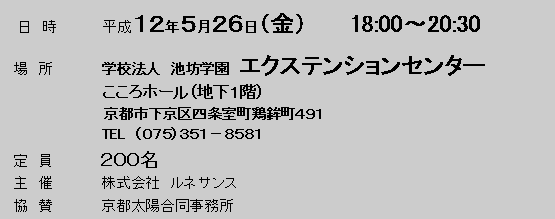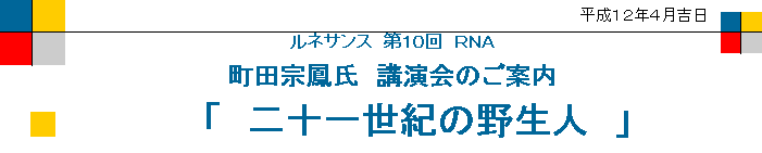 さて、第10回RNA「講演会」を交流誌「ルネサンス」誌面でお馴染みの町田宗鳳氏をお招きしまして開催させていただきます。ご多忙のこととは存じますが、多数お誘い合せの上ご参加下さいますようご案内申し上げます。 敬具