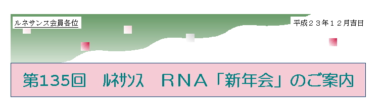 平素は何かとルネサンスRNAの活動にご協力いただきまして有り難うございます。 さて、来たる平成23年1月14日(金)に、第135回RNA「新年会」を開催いたします。RNA会員の皆様と共に楽しいひとときを過ごせたらと思っております。皆様、奮ってご参加下さいますようお待ち申し上げております。 皆様、どうぞよい新年をお迎え下さいませ。 敬具 株式会社ルネサンス 代表取締役 舟橋良博