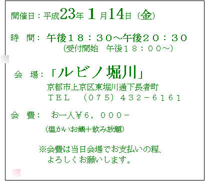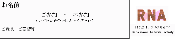 尚、準備の都合上、第135回RNA「新年会」のご出欠のご連絡を平成22年12月28日(火)迄にお手数ですが、必ずお知らせくださいますようお願い致します。 (FAX、電話、E-mailでも受け付けております。)