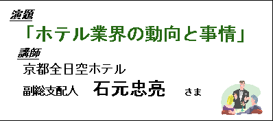 拝啓 向寒のみぎり、皆様ご健勝でお過ごしのことと存じます。今回は、講師に京都全日空ホテルの副総支配人、石元忠亮さまをお招きしまして、ホテル業界のお話を賜ります。皆様には、きっと素晴らしい時間を過ごしていただけるのではないかと存じます。 乞うご期待! ご多忙のこととは存じますが、万障お繰り合わせの上、是非ご参加下さいますようお願い申し上げます。 敬具 ルネサンス 代表取締役 舟橋良博