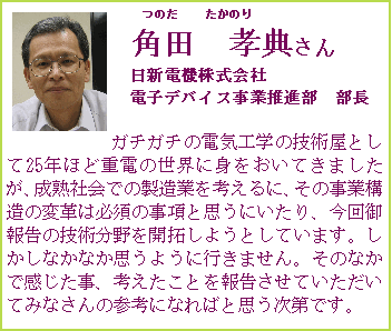 ●講師プロフィール 1951年生まれ、75年名古屋大学電子工学科卒業。同年日新電機入社。特に電力関連の監視制御システムの開発設計に従事。その後技術企画を経て、新規事業の電子デバイス事業推進部を設立、同部長 現在に至る。